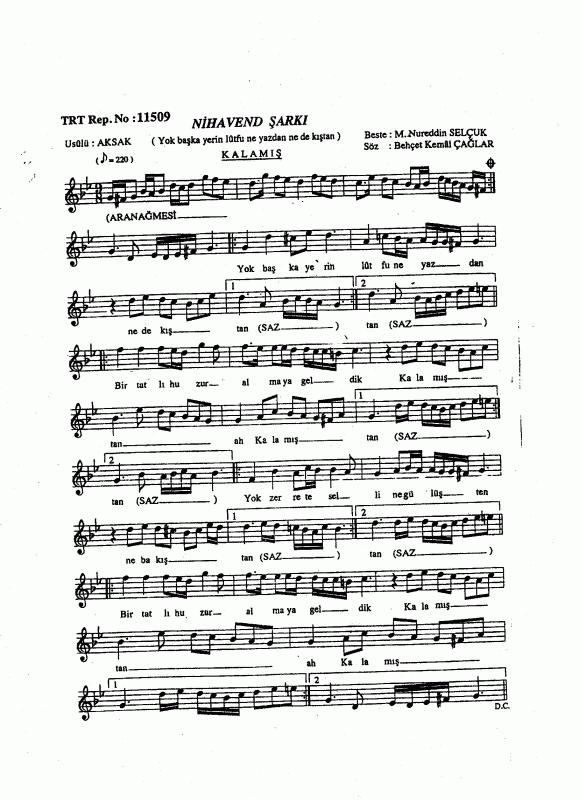 Yok Baska Yerin Lutfu Ne Yazdan Ne De Kistan Kalamis Notalar Sozleri