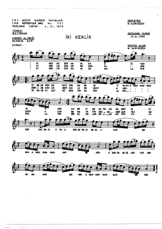 Iki Keklik Bir Kayada Otuyor Notalar Sozleri
